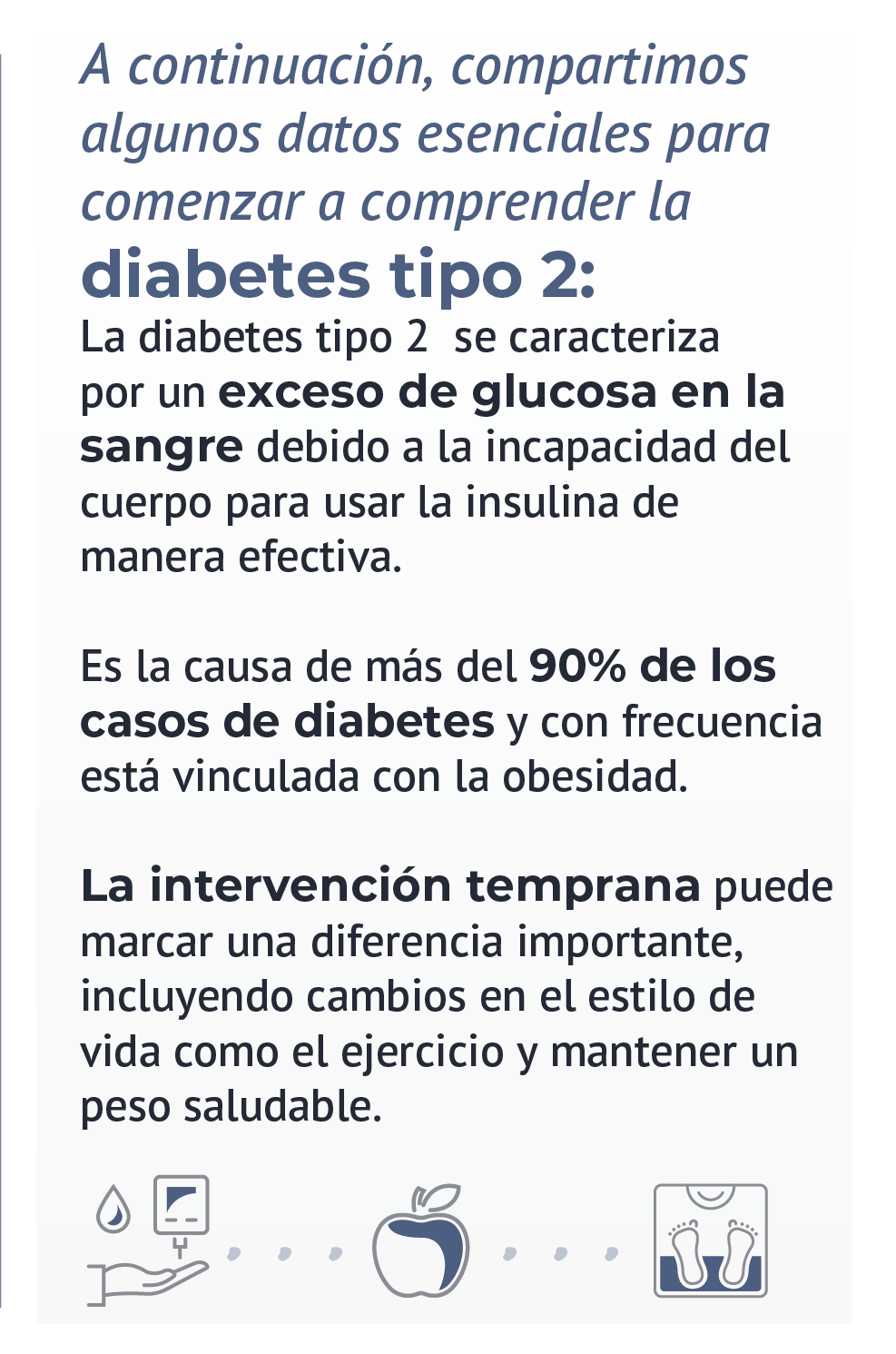 Respuesta: Hay tres principales factores de riesgo para la diabetes: antecedentes familiares de diabetes tipo 2, peso corporal y edad. Muchas veces, la diabetes tipo 2 es silenciosa y asintomática hasta que ha estado progresando por 5 a 10 años. Los síntomas pueden incluir un aumento de sed, orinar con más frecuencia y fatiga persistente aunque inicialmente, estos síntomas pueden ser leves. Cuando las personas buscan asesoría médica, puede que ya sean mayores, por lo que la detección temprana es crucial.